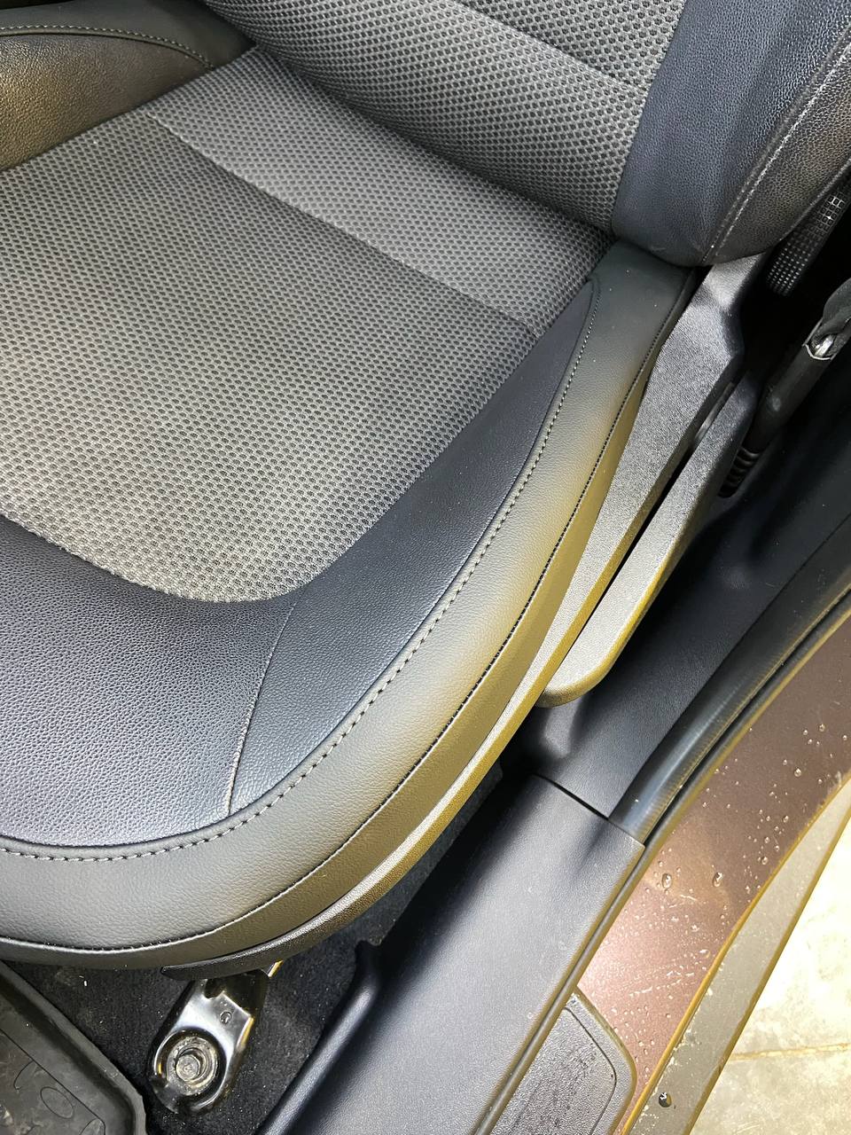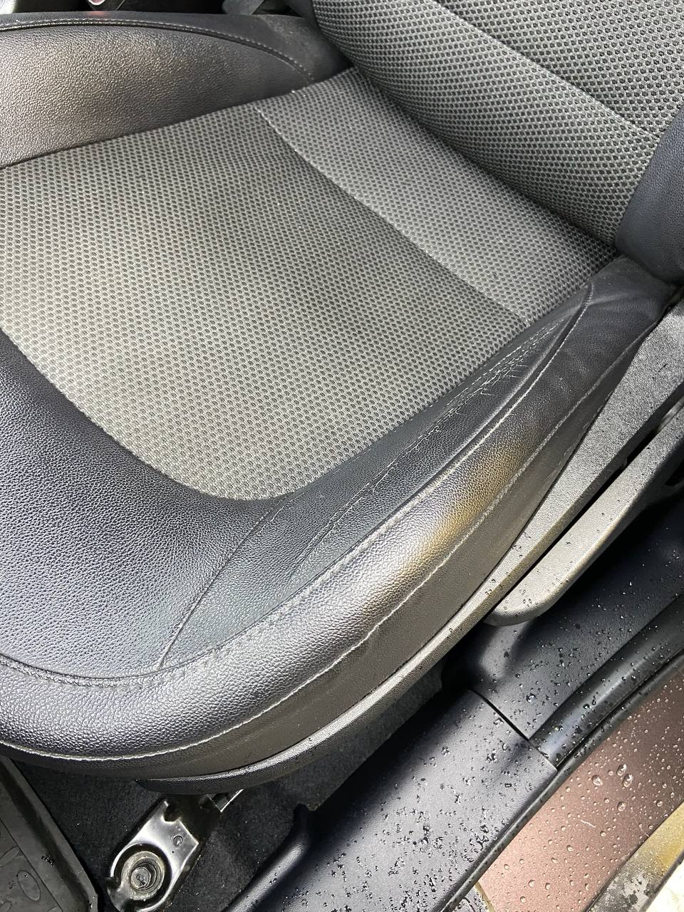 BEFORE: "Typical wear of a black leather car seat: deformation and micro-cracks on the side bolster (exit zone). If these defects are not addressed now, they will quickly turn into deep tears." AFTER: "Restoration of the critical wear zone performed using elastic fillers and a final polymer coating. The leather has been cleaned, restored, and repainted in the factory black color. We didn't just make it look good; we extended the lifespan of the entire seat for years. An investment in preserving your car's value."